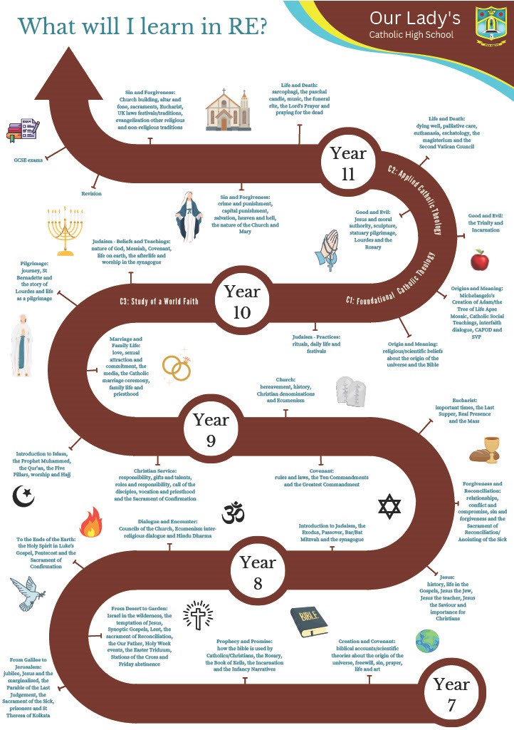 Religious Education is the “core of the core curriculum” (Pope St John Paul II) at Our Lady’s Catholic High School. Our mission is to educate the whole person in discerning the meaning of their existence. Religious Education is concerned with more than just intellectual knowledge as it includes emotional and spiritual learning.