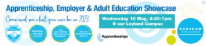 Runshaw College are holding an Apprenticeship, Employer & Adult Education Showcase at their Leyland Campus on Wednesday 10th May between 4:30 – 7pm.